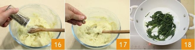 Sazona con sal, pimienta 16 y semillas de hinojo 17, dejando un puñado aparte para la decoración final. Mezcla de nuevo y coloca todo en una manga pastelera con boquilla lisa. Aparte, en una sartén dora un diente de ajo partido por la mitad y añade las otras achicorias. Deja que se sazone bien, haz que se evapore toda el agua de vegetación, retira el ajo, apaga el fuego y resérvalas 18.