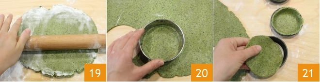 Pasados los 30 minutos puedes proceder a extender tu masa brisa hasta obtener una lámina de aproximadamente 2-3 mm 19. De esta saca discos con un cortador de 11 cm de diámetro 20. Toma un molde para tartaletas (con diámetro de 8,5 cm) y utiliza los discos recién cortados para forrarlo 21.