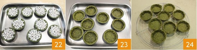 Coloca un cuadrado de papel de horno sobre las tartaletas y cúbrelos con esferas de cerámica adecuadas para la cocción a ciegas 22. Cocina los caparazones de las tartaletas en horno estático precalentado a 180° durante 25 minutos (en horno ventilado a 160° durante 15/20 minutos). Pasado este tiempo retira las bolitas de cerámica 23 y continúa la cocción por unos diez minutos más. Una vez cocidos, saca del horno los caparazones de las tartaletas y deja enfriar sobre una rejilla 24.