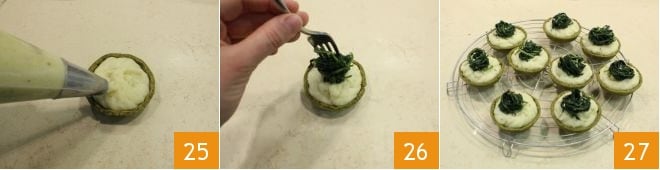 ¡En este punto ya tienes todo listo! Solo queda montar tus tartaletas de enkir con patatas y achicoria silvestre. Rellena cada caparazón con la crema de patatas y hinojo haciendo círculos concéntricos para obtener un relleno uniforme 25. Finalmente, con un tenedor toma un poco de achicoria, como si fueran espaguetis, y colócala en el centro de la tartaleta a modo de nido 26. Completa las tartaletas con algunas semillas de hinojo y sirve 27.