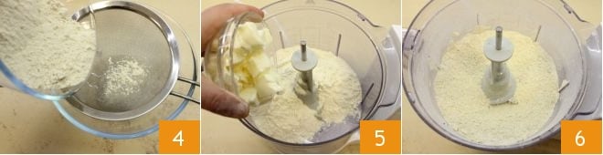 Mientras tanto tamiza la harina de enkir 4 y viértela en un procesador junto con la mantequilla fría cortada en trozos 5 y una pizca de sal. Enciende el procesador y mezcla bien todo, el compuesto no debe mezclarse pero deberás obtener un compuesto arenoso, como si fuera arena 6.