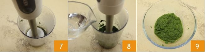 En este punto tritura con una batidora de inmersión la achicoria silvestre 7 añadiendo el agua lentamente 8 hasta obtener una crema muy fina y líquida 9.
