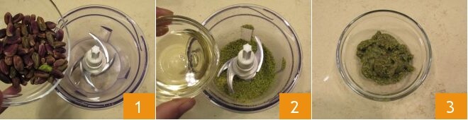 Para preparar el tiramisú de pistacho, poned los pistachos en un procesador de alimentos 1 y trituradlos hasta reducirlos a polvo, luego verted el aceite de sésamo poco a poco 2 y continuad triturando hasta obtener una crema 3. Preparad el café con la cafetera italiana y dejadlo enfriar.