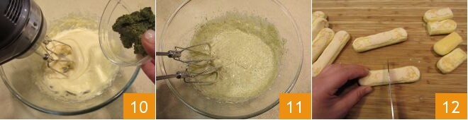 Por último, añadid la crema de pistachos 10, manteniendo siempre en acción las varillas hasta que se integre 11. Ahora, dividid por la mitad los savoiardi 12.