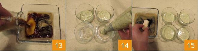 Verted el café preparado con la cafetera en un bol bajo y ancho 13. Luego diluidlo con 30 g de agua a temperatura ambiente. Todo está listo para montar el tiramisú: tomad 4 vasos con capacidad de 140 ml cada uno, ayudándoos con una manga pastelera, exprimid la crema al fondo para crear una primera capa 14, continuad sumergiendo dos mitades de savoiardi en el cuenco con café y agua 15