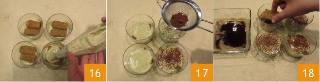 para luego colocarlos dentro del vasito, creando la segunda capa, continuad exprimiendo más crema 16, espolvoread la superficie con cacao amargo 17 y luego nuevamente continuad con otra capa de savoiardi 18