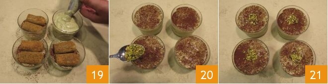 luego otra de crema 19, finalmente terminad con el cacao amargo y la granella de pistachos 20, dejad cuajar en la nevera un par de horas. ¡El tiramisú de pistacho está listo para ser disfrutado 21!