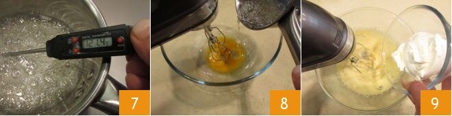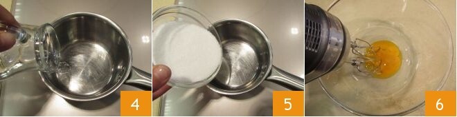 Poned al fuego un cazo con fondo grueso, verted el agua 4 y el azúcar 5 y llevad el jarabe a ebullición, controlando la temperatura con un termómetro alimentario. Cuando la temperatura llegue a los 115°, comenzad a montar las yemas aparte con una batidora eléctrica 6.