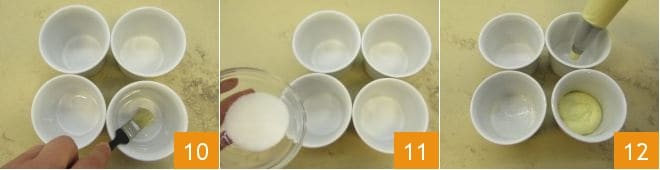 Luego unta solo la base de 4 cocottes de 9 cm de diámetro con un borde alto de 6,5 cm 10, y espolvorea con un poco de azúcar granulada 11. Luego crea la base de bizcochos de soletilla para tus tiramisús: forma una capa en el fondo de aproximadamente 1 cm de grosor 12.