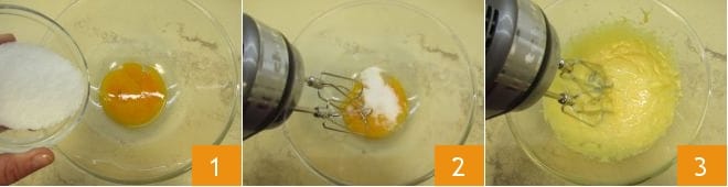 Para preparar el tiramisú de ricotta, comienza haciendo primero los bizcochos de soletilla. Toma el huevo mediano (a temperatura ambiente) y separa la clara de la yema: debes obtener 20 g de yema y 30 g de clara. Vierte en un bol la yema y 30 g de azúcar (tomados de la cantidad de azúcar necesaria para hacer los bizcochos de soletilla) 1, luego bátelos con unas varillas eléctricas 2 hasta que obtengas una mezcla espumosa 3.