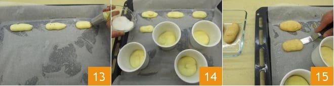 Luego engrasa ligeramente una bandeja y fórrala con papel de horno y realiza los bizcochos de soletilla que serán la capa intermedia de los tiramisús. Haz 4 de aproximadamente 7 cm de largo 13. Espolvorea con el azúcar granulada restante los bizcochos de soletilla que has preparado y la base de las cocottes 14. Hornea tanto las bases como los bizcochos de soletilla juntos en la misma bandeja, en la rejilla del medio del horno en modo estático precalentado a 180°C durante 15 minutos. Saca del horno y retira los bizcochos de soletilla ayudándote con una espátula 15, luego deja cocer 5 minutos más solo las bases de las cocottes.