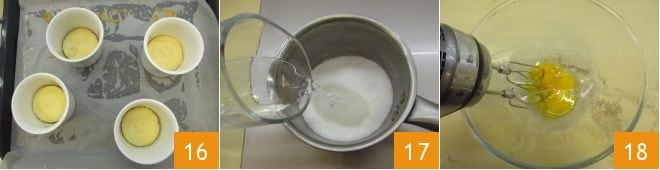 Pasado el tiempo necesario, saca también las cocottes del horno 16 y déjalas enfriar. Mientras tanto, prepara el café con la moka y déjalo enfriar. Mientras tanto, prepara la crema que realizarás con la 'pâte-à-bombe': en un cazo, vierte el azúcar, añade el agua 17, mezcla ligeramente para humedecer el azúcar, luego calienta el jarabe a fuego moderado teniendo cuidado de insertar un termómetro para alimentos para poder controlar la temperatura que debe alcanzar los 121°. Mientras tanto, en un bol, vierte los 40 g de yemas necesarios para la crema (las yemas de aproximadamente 2 huevos medianos) y bátelas con las varillas 18