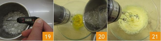 Tan pronto como el jarabe de agua y azúcar haya alcanzado los 121° 19, incorpóralo en un hilo a las yemas manteniendo en acción las varillas 20, continúa montando la mezcla hasta que esté completamente enfriada, volviéndose al mismo tiempo clara y espumosa 21.
