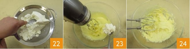 Ahora tamiza la ricotta con un colador de malla fina para que quede más fina 22 e incorpórala poco a poco a la mezcla obtenida. Mezclando siempre con las varillas 23 hasta que esté completamente integrada 24.