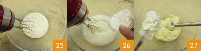 En este punto, monta con las varillas eléctricas (previamente bien limpias) también la nata fresca 25 y añade poco a poco el azúcar glas 26. Cuando la nata esté bien montada, incorpórala a la crema de ricotta 27.