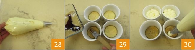 Transfiere la mezcla obtenida a una manga pastelera con boquilla lisa de 15 mm de diámetro 28 y ponla en el frigorífico. Todo está listo para componer el tiramisú de ricotta: retoma tus cocottes con la base de bizcochos de soletilla, mójalas con el café ya frío usando un pincel de cocina 29 y luego rellena con una capa de crema llenando hasta la mitad de la cocotte 30. Deja reposar el tiramisú en el frigorífico durante al menos 2 horas.