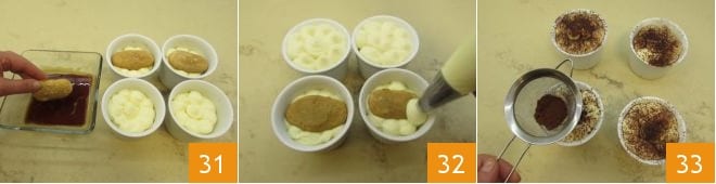 Pasado el tiempo de reposo, retoma los bizcochos de soletilla, sumérgelos en el café y colócalos sobre la crema 31. Cubre los bizcochos de soletilla con copos de crema 32; puedes dejar reposar otra hora en el frigorífico para estabilizar más la crema o puedes espolvorear tus tiramisús de ricotta con cacao en polvo 33 y servirlos directamente!