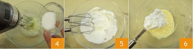 Por separado, en otro bol, monta con las mismas varillas (previamente limpiadas de manera adecuada) la clara con el azúcar restante 4 hasta que esté a punto de nieve 5. Incorpora las claras poco a poco a las yemas y azúcar trabajadas anteriormente, mezclando de abajo hacia arriba para no desmontar la mezcla 6.