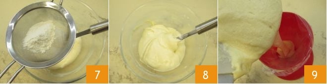 En este punto, tamiza la harina directamente en el bol con la mezcla de huevos 7 y mezcla de nuevo de abajo hacia arriba para evitar desmontar la mezcla 8. Ahora transfiere la mezcla a una manga pastelera con boquilla lisa de 16 mm de diámetro 9.