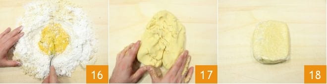 Luego comienza a mezclar todo primero con el tenedor 16, luego cuando los huevos hayan absorbido bien la harina, puedes continuar a mano 17. Amasa brevemente, solo el tiempo necesario para compactar la masa, para evitar que la masa quebrada se caliente demasiado con el calor de las manos y se mantenga quebradiza. Forma un bloque y aplánalo antes de envolverlo en film plástico 18;