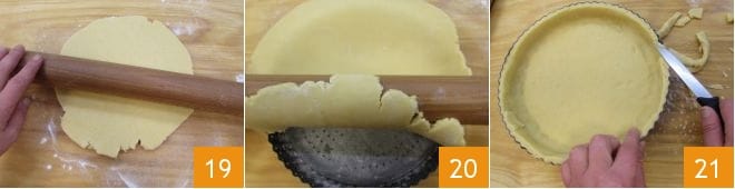 guárdalo en la nevera para que se endurezca al menos 30 minutos. Pasados los 30 minutos, extiende con un rodillo la masa quebrada hasta obtener un grosor de aproximadamente 1 cm 19, luego coloca la masa sobre el molde de 24 cm de diámetro 20, retira los bordes que sobresalen del molde 21,