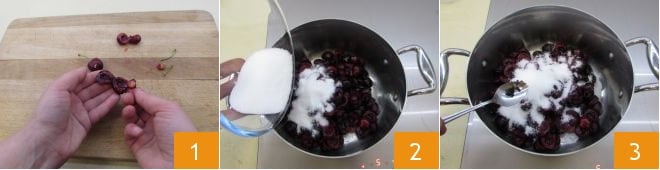 Para preparar la tarta de cerezas con merengue, primero prepara la compota. Lava y deshuesa las cerezas 1, viértelas en una cacerola y añade el azúcar 2, las semillas de la vaina de vainilla 3,