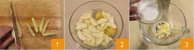 Para realizar la tarta de manzana y Nutella, primero pelad las manzanas y cortadlas en gajos de medio centímetro de grosor 1, colocad los gajos en un bol lleno de agua fría acidulada con el zumo de limón para que no se oscurezcan y ocupáos de la masa. Colocad en un robot de cocina con varillas la mantequilla previamente ablandada junto con el azúcar 3 y batid los ingredientes hasta formar una crema blanca y espumosa.