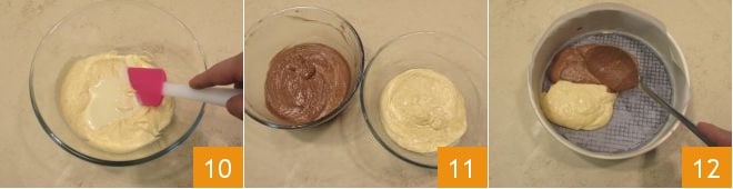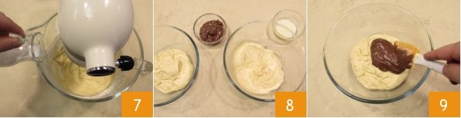 alternando con la adición de la leche a temperatura ambiente 7. Mezclad bien los ingredientes, luego dividid la masa en dos partes iguales 8 e incorporad en un bol la Nutella 9