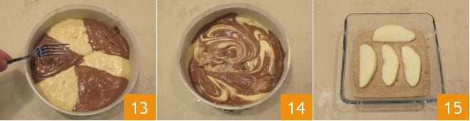 una vez terminadas las masas 13, cread el efecto marmoleado: pasad en espiral un tenedor de arriba hacia abajo a través de los dos colores de la masa 14. Escurrid las rodajas de manzana del agua acidulada, tomad cada gajo, pasadlo por azúcar moreno para cubrirlo completamente 15.