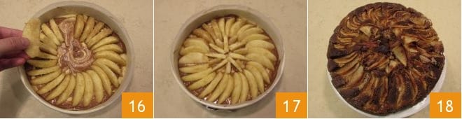 Colocad los gajos sobre la tarta creando un motivo en forma de rayo (16-17). Hornead la tarta en horno estático precalentado durante unos 55 minutos a 180° (en horno ventilado durante 45 minutos a 160°). En los últimos minutos, colocad sobre la tarta una hoja de papel de aluminio que servirá para que no se oscurezca demasiado. Comprobad la cocción verificando con un palillo: si al pinchar en profundidad la tarta no quedan residuos en el palillo, el postre estará cocido. Una vez cocido, sacad la tarta 18 y dejadla templar antes de servirla.