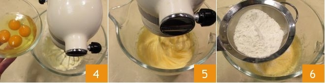 Añadid los huevos a temperatura ambiente uno a uno 4, la sal y batid durante al menos 5 minutos, hasta obtener una mezcla homogénea y sin grumos 5. Añadid a la mezcla obtenida la harina previamente tamizada con la levadura 6