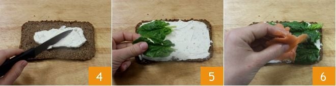 Compón la tarta: toma una rebanada de pan rectangular (si es de otra forma, dale la forma que prefieras), colócala sobre la tabla de cortar y úntala con crema 4 luego añade hojas de espinacas (lavadas y secas) y algunas lonchas de salmón (5-6).