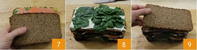 Cubre con una rebanada de pan 7 y vuelve a comenzar con la crema de queso, las espinacas y el salmón, hasta agotar todos los ingredientes 9. Termina con una rebanada de pan 9 y coloca la tarta de salmón en el frigorífico para que se endurezca.