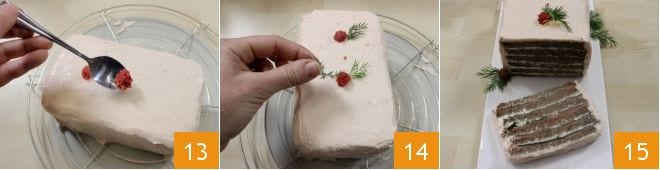 Prepara ahora la crema para la cobertura: toma 300 gr de queso y bátelos junto con el salmón 10 y una cucharada de leche, hasta obtener una crema muy lisa 11, que dejarás en el frigorífico al menos 30 minutos para que sea más fácil de untar. Pasado este tiempo, extiende la crema sobre la superficie del pan y los lados, de modo que cubra toda la tarta 12 con una espátula apropiada o un cuchillo de hoja lisa. Una vez cubierta por completo, colócala en el frigorífico al menos una hora para que se endurezca.