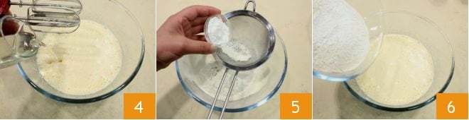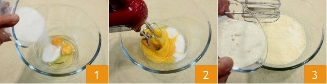 Para preparar la tarta en sartén, comienza batiendo los huevos con el azúcar con una batidora eléctrica (1-2); cuando los huevos estén bien montados y espumosos, añade el yogur a la mezcla 3.