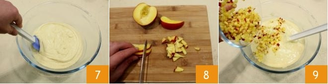 Mezcla cuidadosamente con una espátula 7; luego corta el melocotón en trozos pequeños 8 e incorpóralo a la masa 9