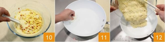 mezcla de nuevo para integrarlo bien 10. Ahora unta con mantequilla una sartén antiadherente o de cerámica de 22 cm de diámetro con bordes suficientemente altos con un poco de mantequilla: extiéndela ayudándote con papel de cocina 11. Calienta la sartén a fuego bajo, luego vierte la mezcla 12.