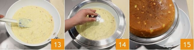 Nivela con una espátula para distribuirla uniformemente 13: cuece a fuego muy bajo durante unos 40 minutos con la tapa puesta 14; revisa de vez en cuando la cocción para verificar si es necesario voltear la tarta antes del tiempo indicado). Pasado el tiempo necesario, ayúdate con la misma tapa para voltear la tarta y cocinarla del otro lado como si fuera una tortilla: dale la vuelta a la tarta sobre la tapa y desliza la parte cruda en la sartén 15.