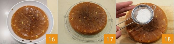 Cocina la tarta durante unos 10 minutos también por este lado 16. Puedes hacer la prueba del palillo para verificar que el interior esté seco. Una vez cocida, deja que se enfríe completamente sobre una rejilla 17 y luego espolvoréala con azúcar glas antes de servirla 18.