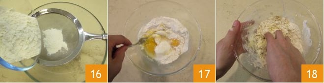 Al día siguiente, prepara la pasta fresca: tamiza la harina en un bol muy grande 16 o sobre una mesa de trabajo, luego añade los huevos a temperatura ambiente y rápidamente batidos con un tenedor 17 y mezcla los ingredientes a mano hasta obtener una masa suave y no pegajosa 18. Si resulta aún pegajosa (puede depender del grado de absorción de la harina utilizada) añade un poco más de harina sin exagerar; si por el contrario la masa queda seca, puedes humedecerla añadiendo un poco de agua a temperatura ambiente. Además, es importante respetar la cantidad de huevos indicada para obtener una consistencia perfecta de la pasta al huevo.