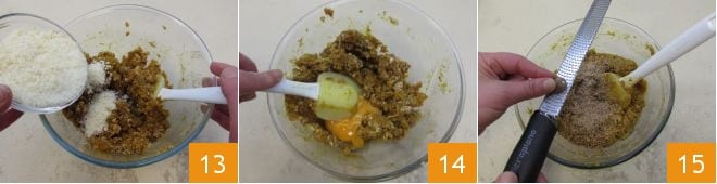 y añade también el queso rallado 13, mezcla bien e incorpora también el huevo 14. Una vez que se haya absorbido en el relleno, sala al gusto y aromatiza con nuez moscada 15. Cubre con film transparente y coloca en el frigorífico a reposar toda la noche, mejor aún por 24 horas.