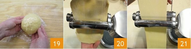 Dale a la masa una forma esférica 19 y envuélvela en film transparente. Deja reposar a temperatura ambiente en un lugar fresco durante al menos 30 minutos. Pasado el tiempo necesario, retoma la masa y divídela al menos en dos partes (a medida que la trabajas, deja cubierta con film la parte que aún no usas); con la máquina de hacer pasta o con un rodillo, extiende cada pieza de masa hasta obtener rectángulos de aproximadamente 2 mm de grosor (20-21).