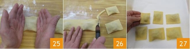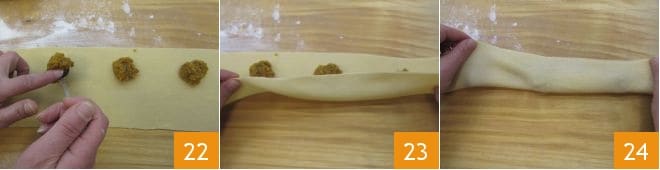 Extiende la pasta sobre una superficie ligeramente enharinada, iguala la pasta con un cortapastas para obtener una tira de 9 centímetros de ancho y coloca sobre ella montoncitos de relleno (aproximadamente 15 g) en la parte superior de la tira (dejando al menos 1 cm del borde) distanciando unos centímetros un montón del otro, a lo largo de toda la tira de pasta fresca 22. Dobla la tira de pasta fresca para cubrir el relleno (23-24): si la masa está un poco seca, puedes pincelarla ligeramente con un poco de agua.