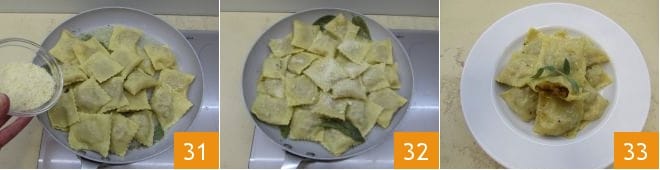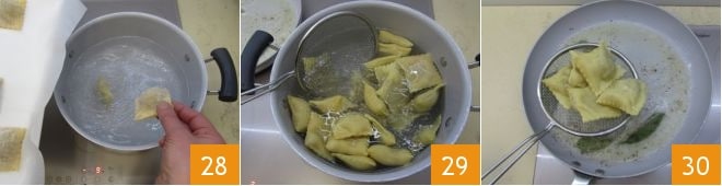 Luego pon al fuego una cacerola grande con agua salada al gusto. Luego prepara el condimento derritiendo en una sartén muy amplia la mantequilla con la salvia y sala ligeramente y apaga el fuego cuando esté completamente derretida, teniendo cuidado de no quemarla. Cuando el agua hierva, sumerge los tortelli de calabaza para cocerlos 28: bastarán 3-4 minutos. Luego escúrrelos con una espumadera 29 directamente en la sartén con la mantequilla ya derretida y la salvia 30.