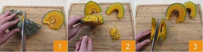 Para preparar los tortelli de calabaza, comienza con el relleno que deberá reposar en el frigorífico al menos toda la noche o mejor aún por 24 horas, para que los sabores se mezclen. Toma la calabaza y divídela en partes 1 para eliminar más fácilmente las semillas y los filamentos internos 2. Luego córtala en rodajas 3