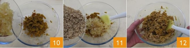 Luego añade a la calabaza la mostaza 10 y los amaretti desmenuzados 11, mezcla con una espátula 12