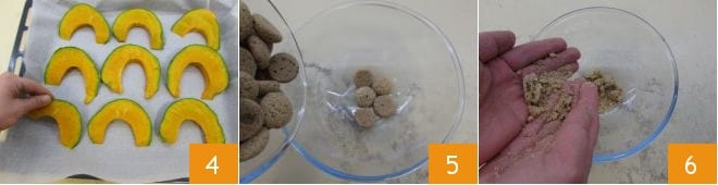y colócalas en una bandeja forrada con papel de horno 4: hornéalas en horno estático precalentado a 220° durante unos 20 minutos (si es horno ventilado a 200° durante unos 10 minutos). Revisa de vez en cuando la cocción, pinchando la pulpa con las púas de un tenedor: la calabaza debe estar suave, pero no quemarse. Mientras la calabaza se cocina, recoge los amaretti en un bol y desmenúzalos con las manos (5-6).
