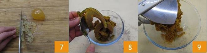 Pica con un cuchillo la mostaza mantovana de peras (o membrillos) 7. También puedes usar una picadora si prefieres un resultado más fino. Una vez cocida la calabaza, déjala enfriar en el horno apagado, para que se seque y pierda la mayor cantidad de agua posible. Luego toma la pulpa cocida ayudándote con un sacabolas o una cuchara 8 y pásala por un pasapurés 9, recogiéndola en un bol pequeño.