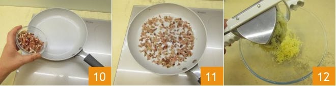 Poned al fuego una sartén antiadherente y, cuando esté caliente, añadid la panceta 10 dejándola dorar durante 2-3 minutos hasta que se vuelva crujiente 11. Tomad las patatas, que mientras tanto se habrán enfriado, y machacadlas en el prensa-patatas, recogiendo la pulpa en un bol 12.