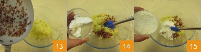 A las patatas, añadid la panceta crujiente 13, la ricotta 14 y el Parmigiano rallado 15.